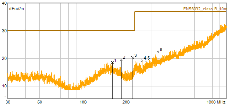 中顯科技YY系列串口屏采取了有效的輻射發射抑制措施,全系產品都可以達到ClassB等級要求。SDWb、SDWn、SDWa三個系列的部分型號串口屏,在不做任何整改措施下也可以達到ClassB等級要求,如圖2所示為SDWb070T84T串口屏在裸露狀態下的測試數據波形。如對輻射發射性能有要求的應用,歡迎聯系咨詢!