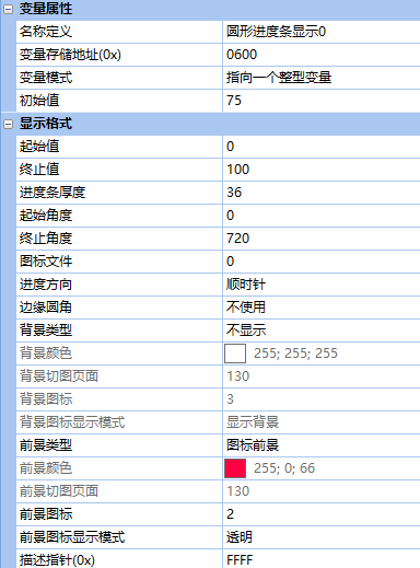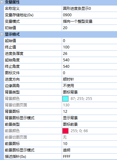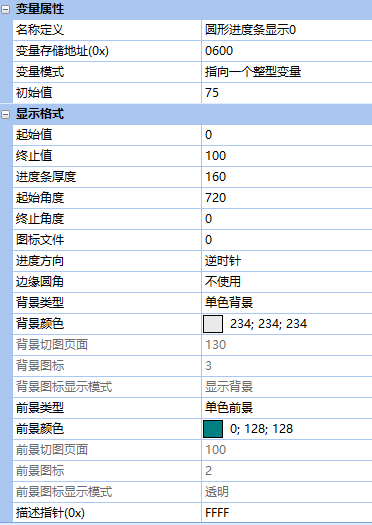 在VGUS組態軟件中,控件位置為:變量配置->圓形進度條顯示。